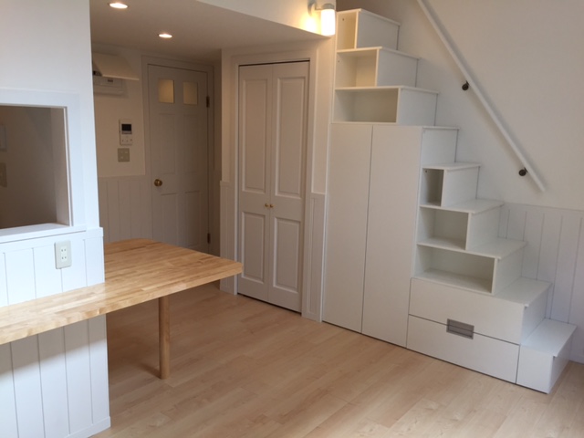 右写真の収納階段はコートもかけれるので、女性には嬉しいところ。