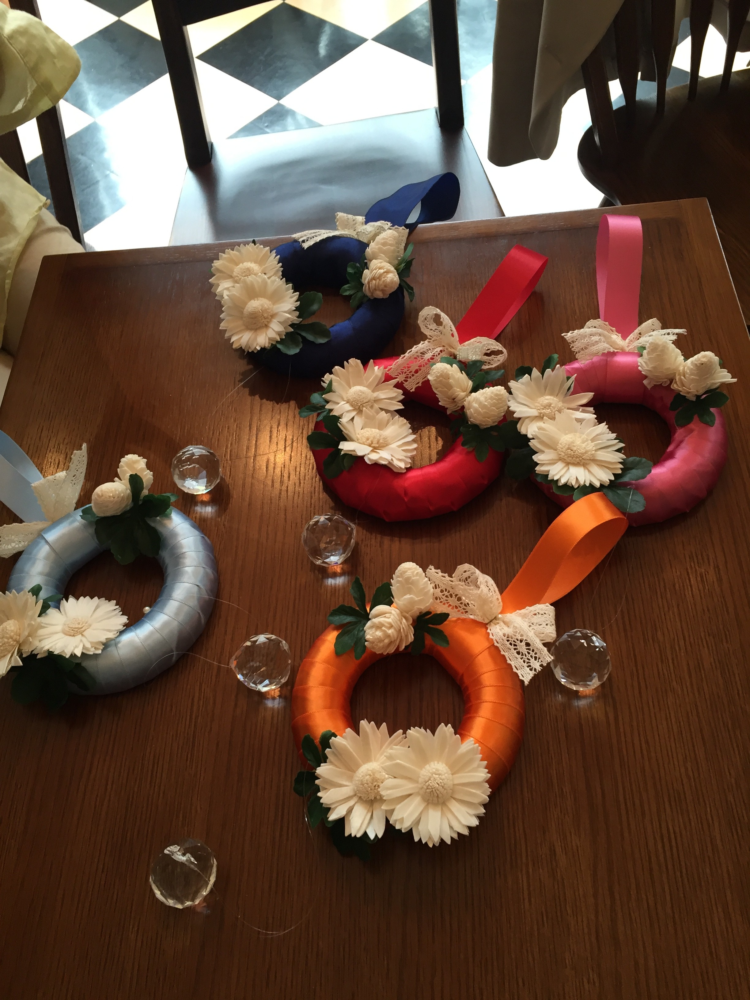 それぞれのラッキーカラーを使って、サンキャッチャー付きのリボンのリースができました♪