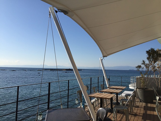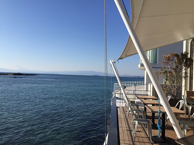 当社のある葉山から、海岸沿いを南下すると佐島に着きます。佐島マリーナにづづく小道を進むと、スタイリッシュなイタリアンがあります。屋外の客席は、ウッドデッキ調の設えで、眼下は波打ち際、目の前には相模湾が広がります。見通しの良い日には、富士山が望むことが出来ます。