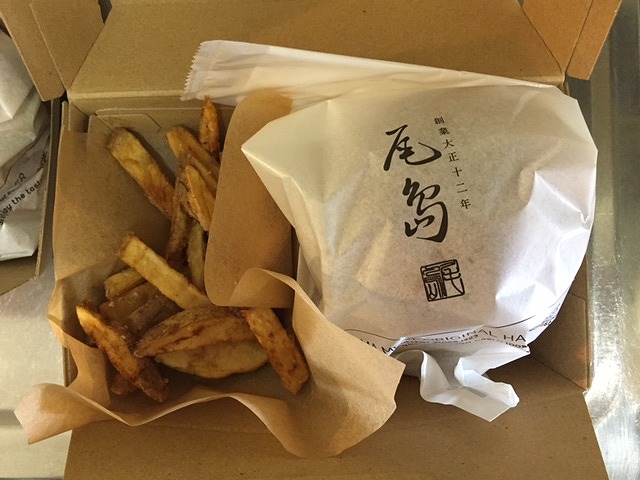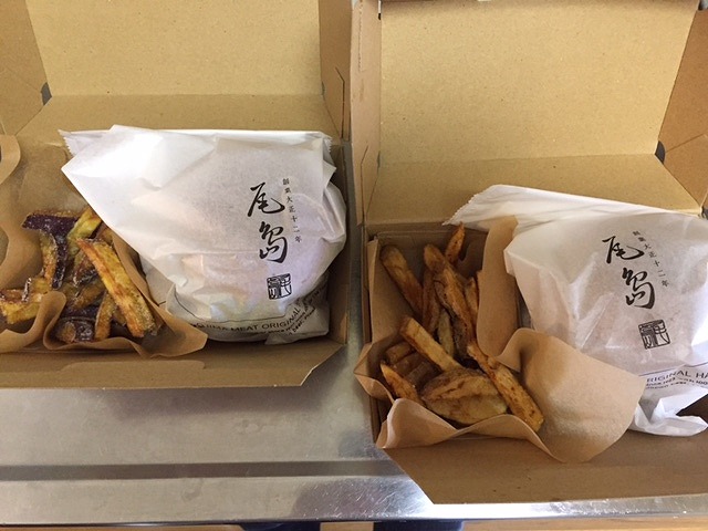 な具と持っちりしたバンズ。付け合わせのフライドポテトは、ジャガイモとサツマイモの何れかを選べま