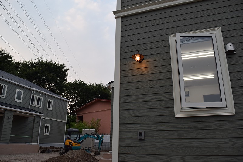 ました。二棟並ぶ建物の正面向かって右側の建物の照明器具の内部に雨水が侵入して、曇っています。引渡し日程