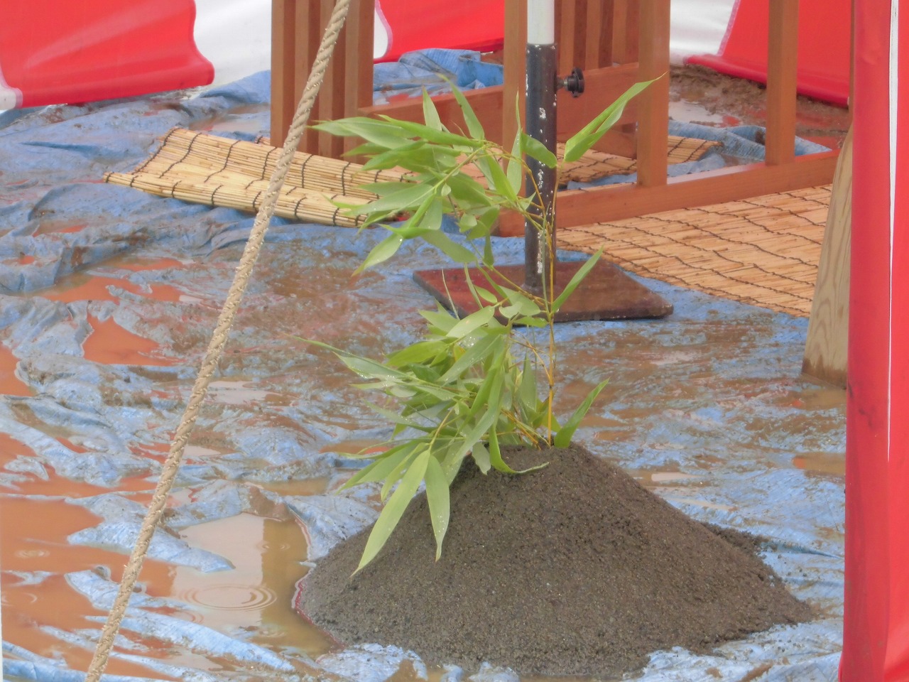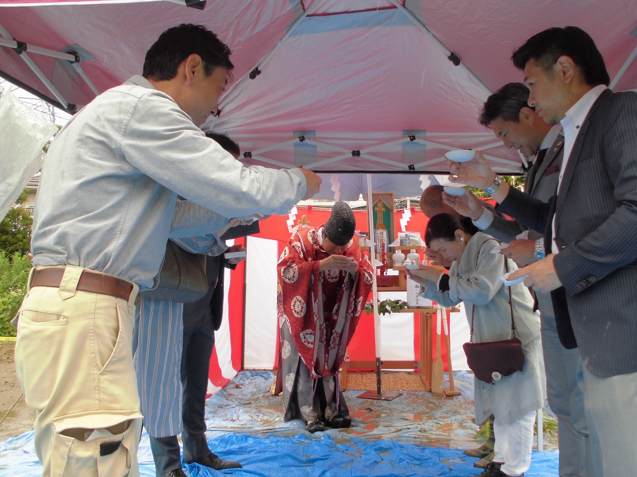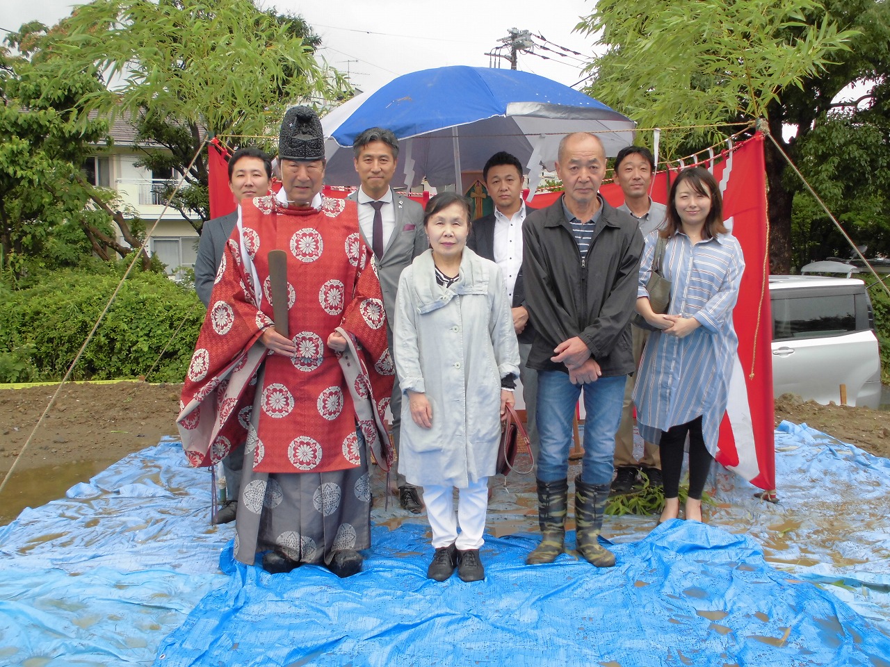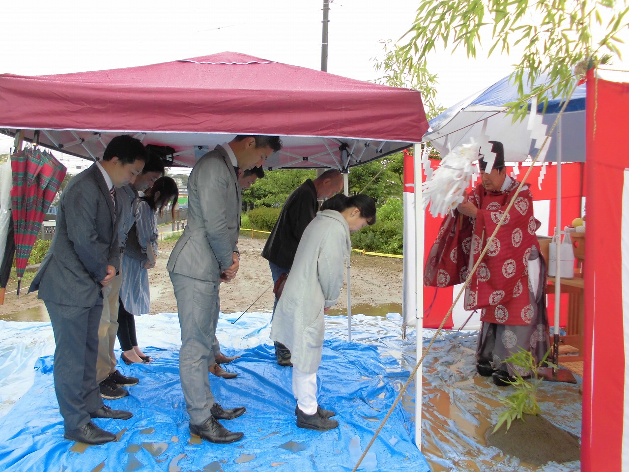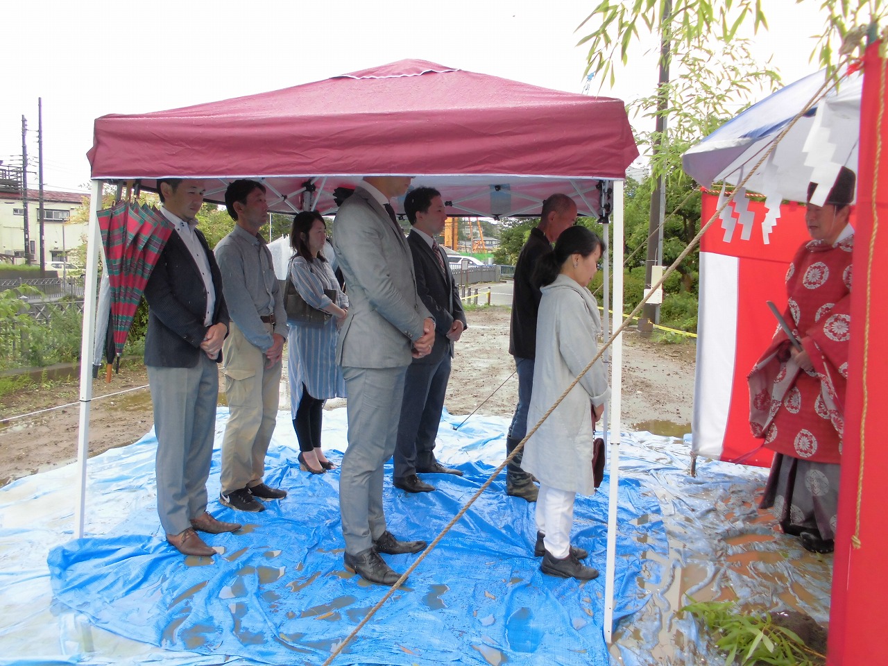 梅雨の雨空の下、横浜市栄区で障がい者グループホームが着工です。現地で施主様を交え、地鎮祭を実施しました。