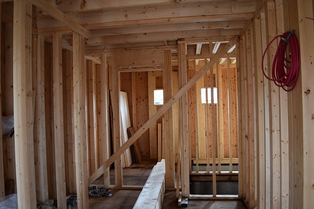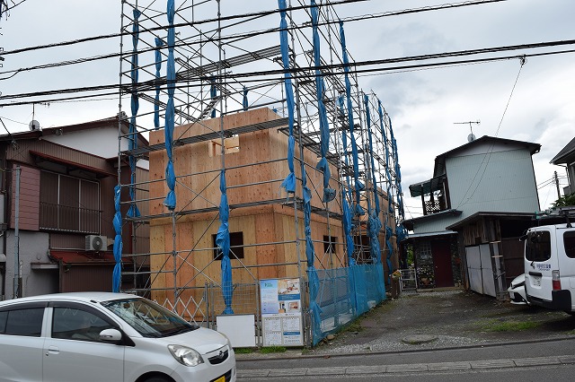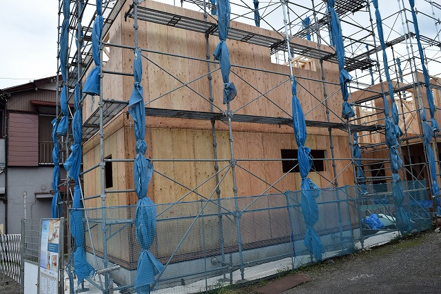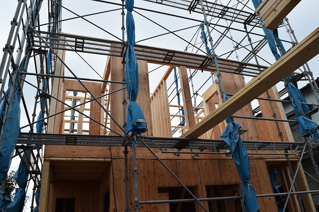 秦野市内で進む障がい者グループホームの現場です。2階の外壁まで工事が進みました。敷地が比較的狭いため、2棟に分かれたプランで建物の間に外部階段が設置されます。