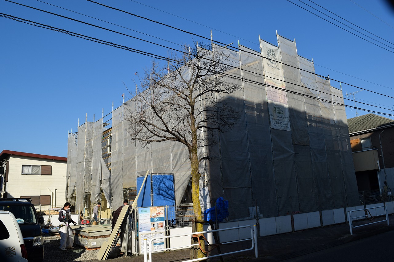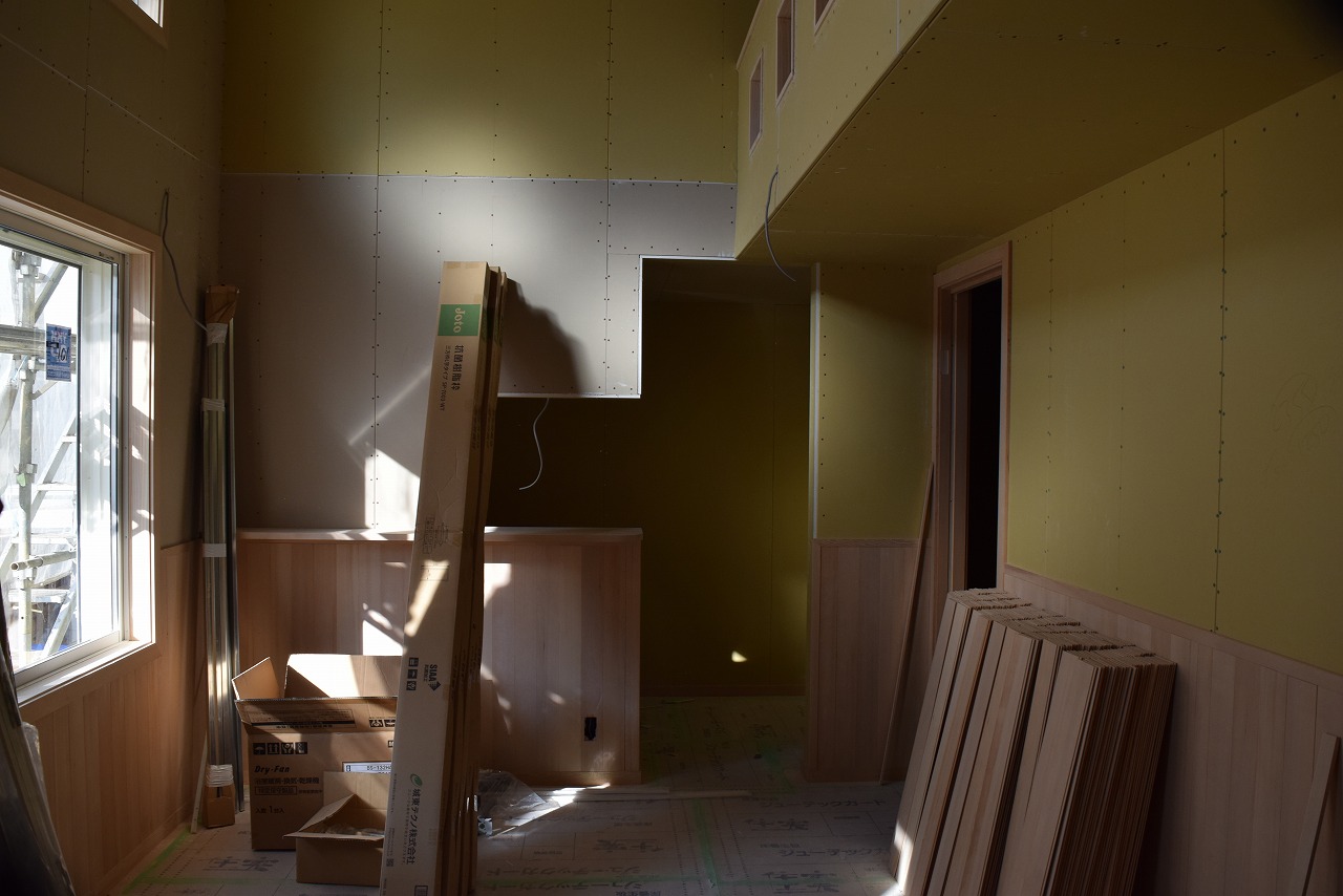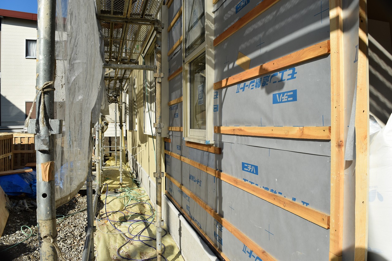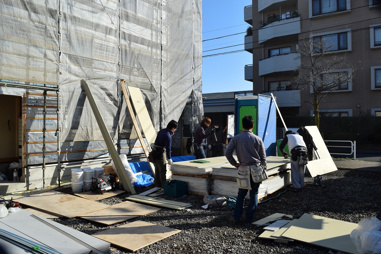 現在、各居室の大工工事がほぼ完了し、設備、クロスの施工に移ります。4外では外壁タイル工事