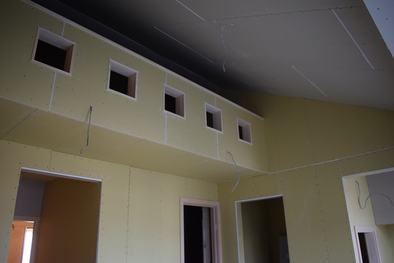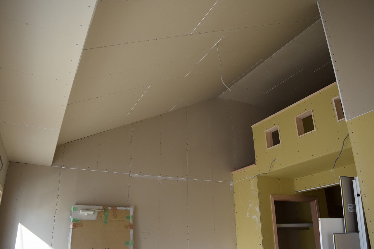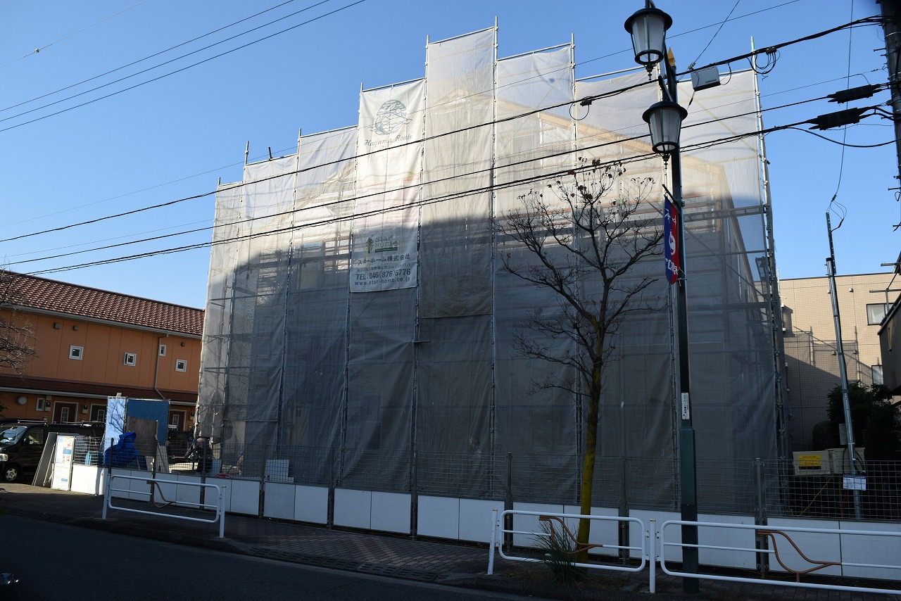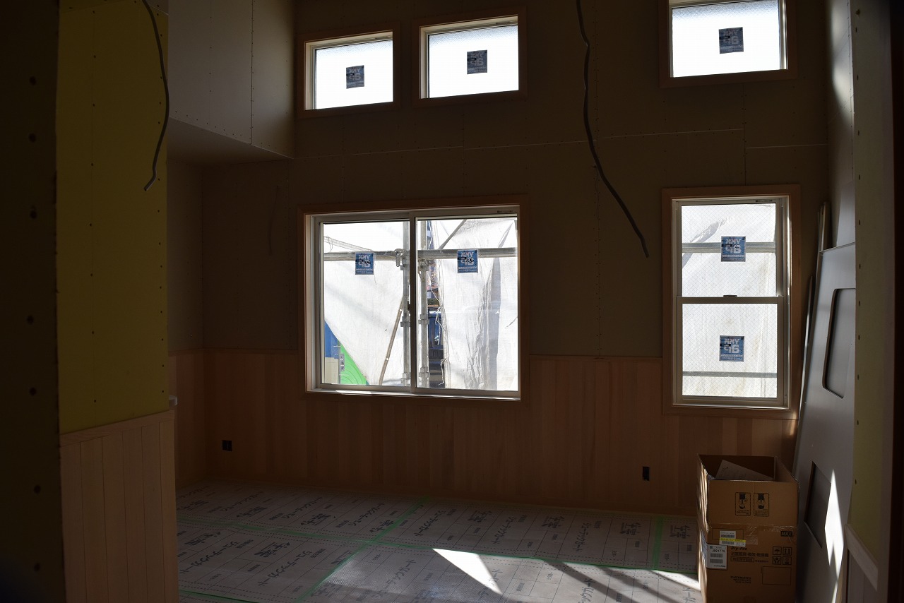 現在、各居室の大工工事がほぼ完了し、設備、クロスの施工に移ります。4外では外壁タイル工事