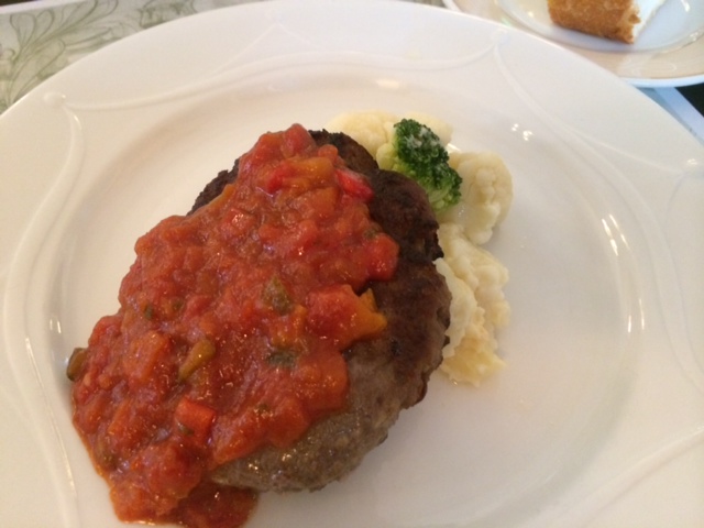 メニューは、トマトソースハンバーグ(サラダ、スープ、パン、デザート付)